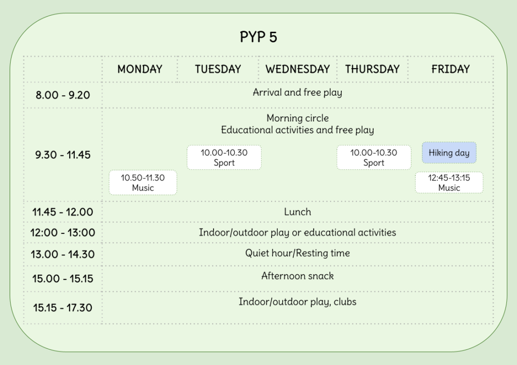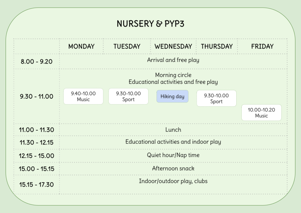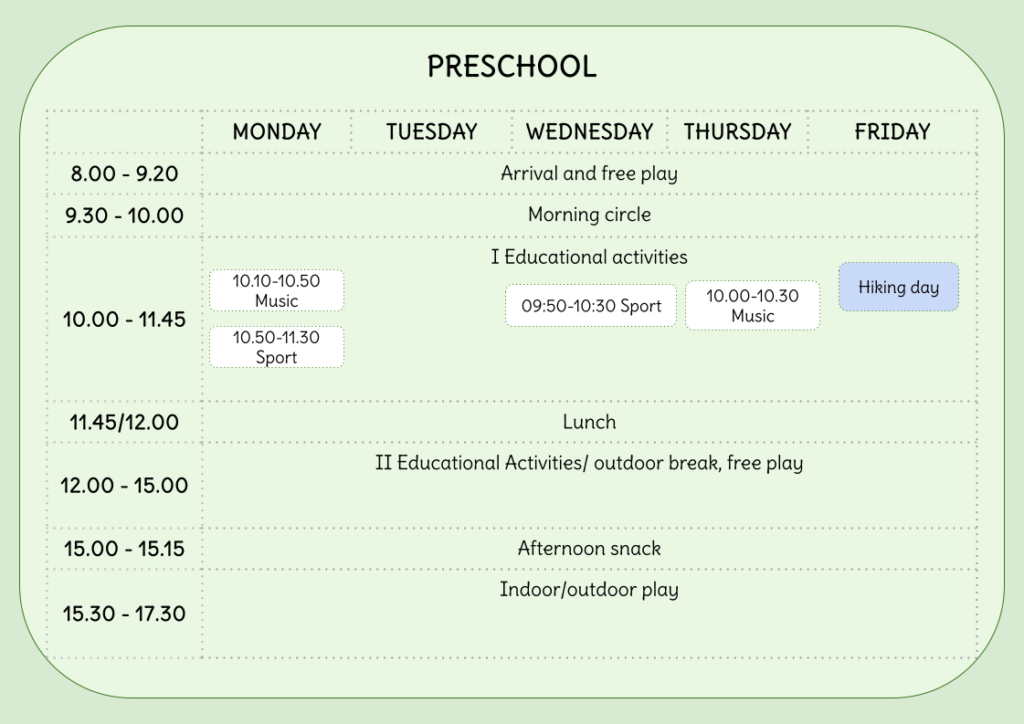 Kindergarten is open from 8:00 to 17:30. Children can arrive from 8:00, which allows time for a calm drop-off, free play, and settling into the day. Organised educational activities begin at 9:30, so it is recommended to arrive before the activities start. Many of the educational activities and free play sessions also take place outdoors. One day a week is always saved for hiking.